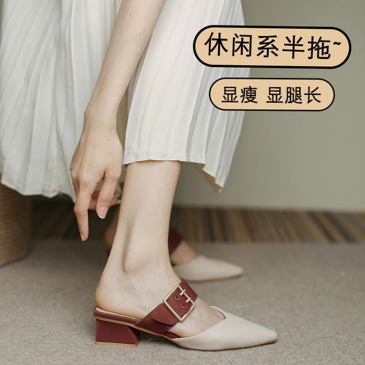 夏天配裙真皮女鞋2023直播爆款鞋子淑女風百搭粗跟包頭后空涼拖鞋
