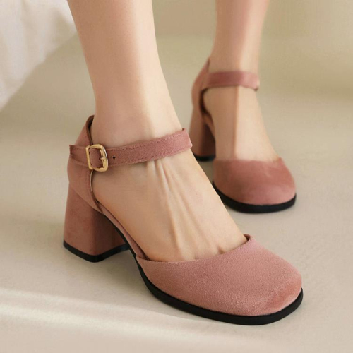 方頭包頭女涼鞋絨面粗跟高跟中空女涼鞋簡約一字扣帶瑪麗珍涼鞋