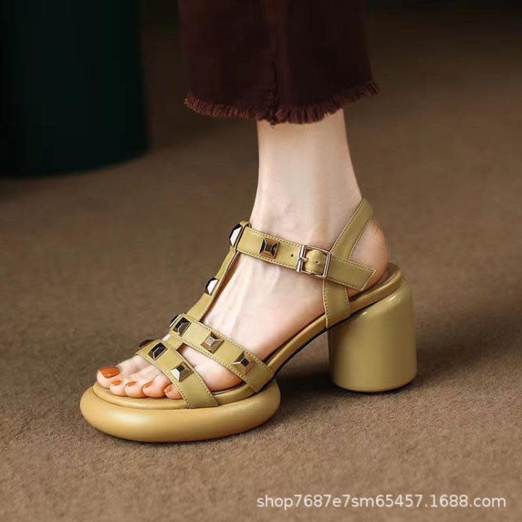 高跟鞋 露趾粗跟外穿一字帶涼鞋女百搭仙女2023新款夏季鉚釘時尚涼鞋
