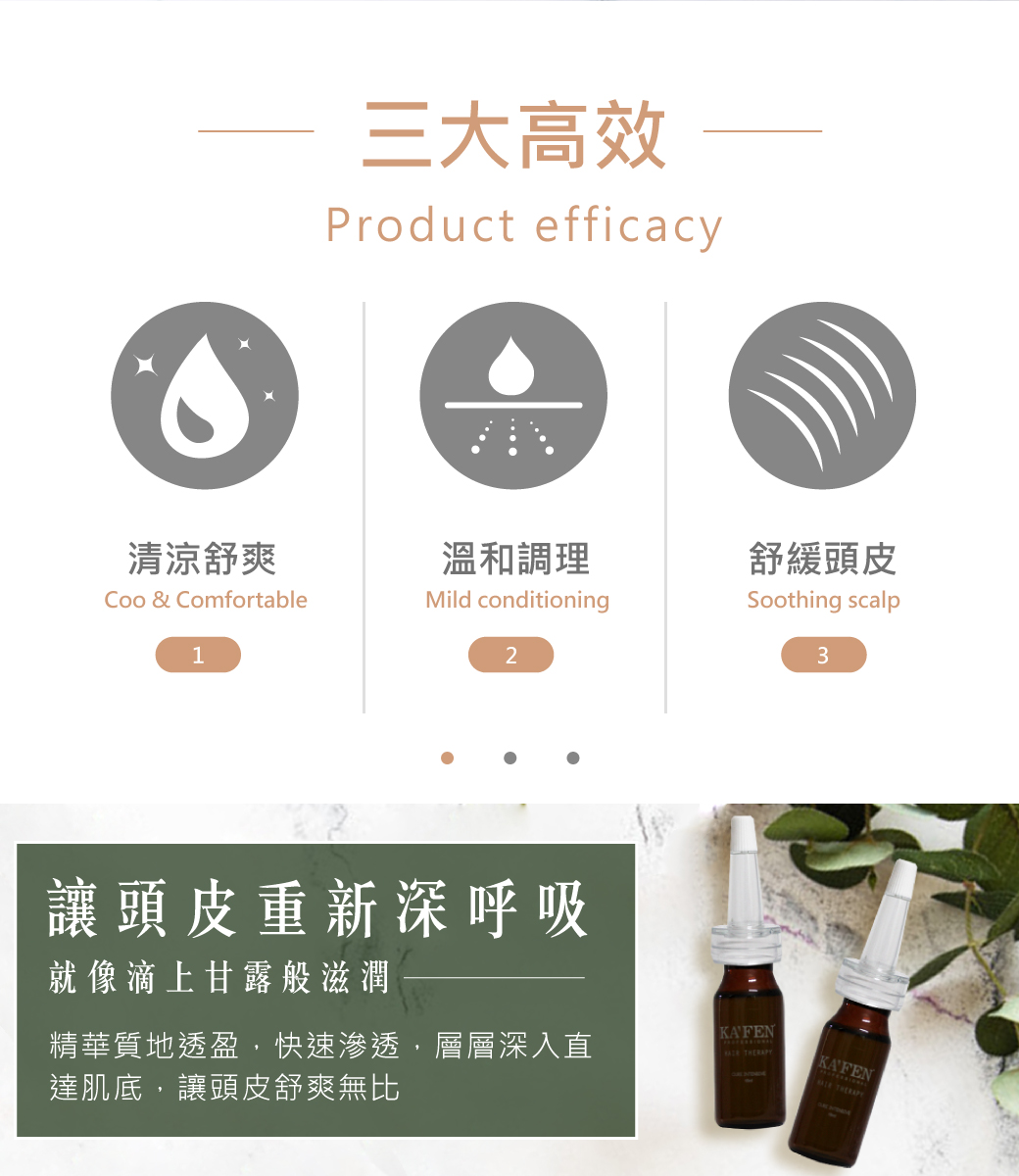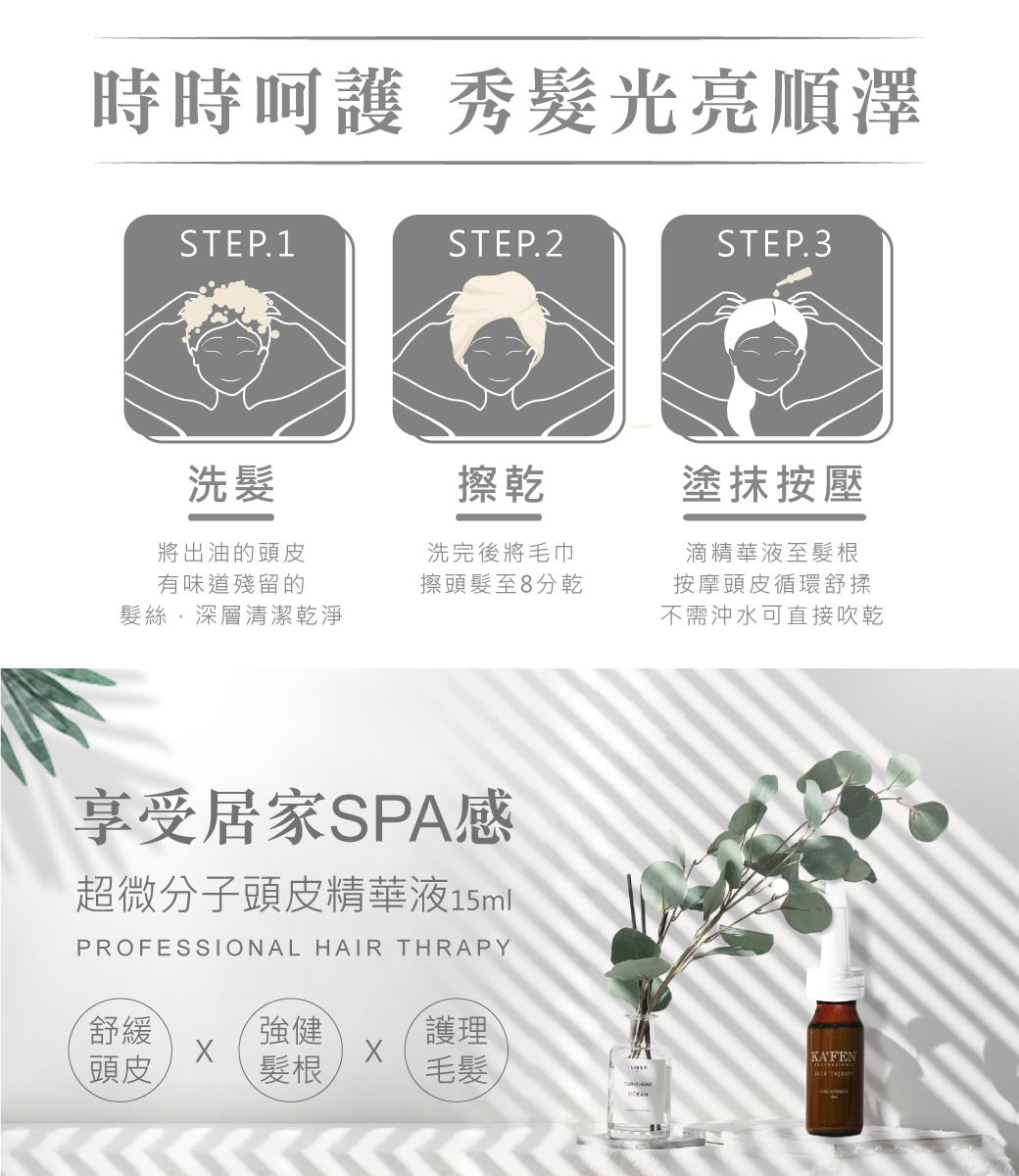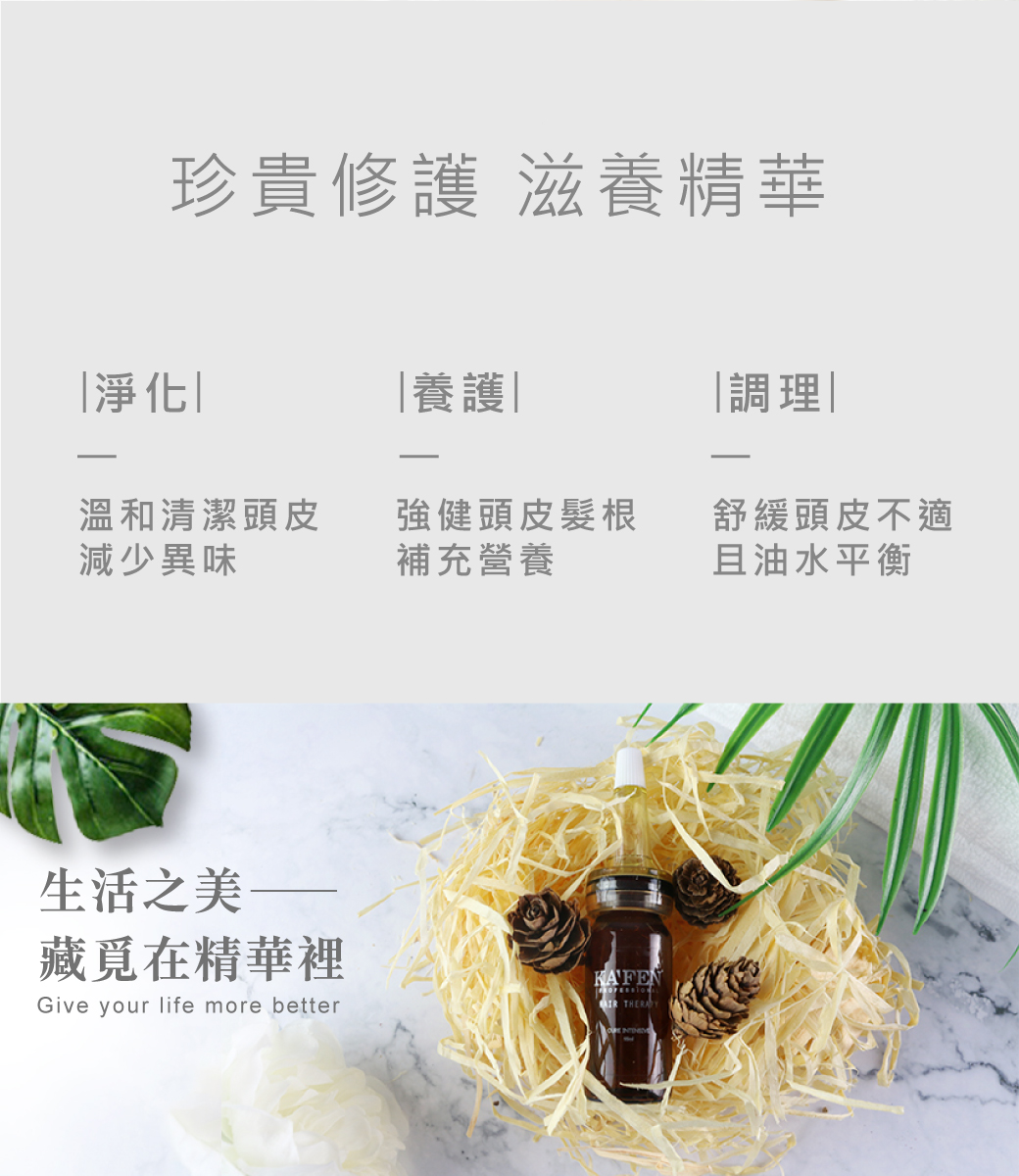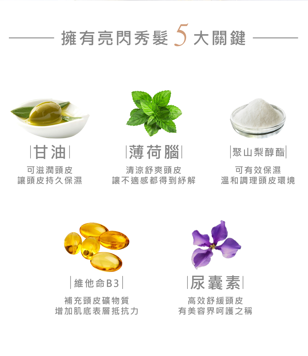 頭髮強靭,保持頭皮水分、油分平衡度、減少多餘油脂分秘。