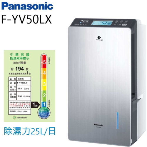 商品規格 型號:F-YV50LX 除濕能力:25公升/日 除濕適用坪數:32坪 節能能源效率:第一級 消耗電功率(W):359 EF-能源因數值(L/kWh):2.90 年耗電量(度):194 除濕濕度設定:40%~70% 定時功能:1~12(h) 清淨nanoe™ X:有 奈米銀抗菌清淨濾網:有 前方面板顯示:斜面操作面板 出風設計:廣角出風 底部滑輪:萬向輪+後煞車設計 電源線收納:自動捲線 安全裝置:35項 適用室溫範圍:1°C~40°C 電源:110V/60Hz 商品尺寸:680高x380寬x320深mm 包裝尺寸:802高x456寬x395深mm 水箱容量:5.5L 機體重量:20.5kg 總重量:22.5kg BSMI:R73023 保固:3年 產地:台灣