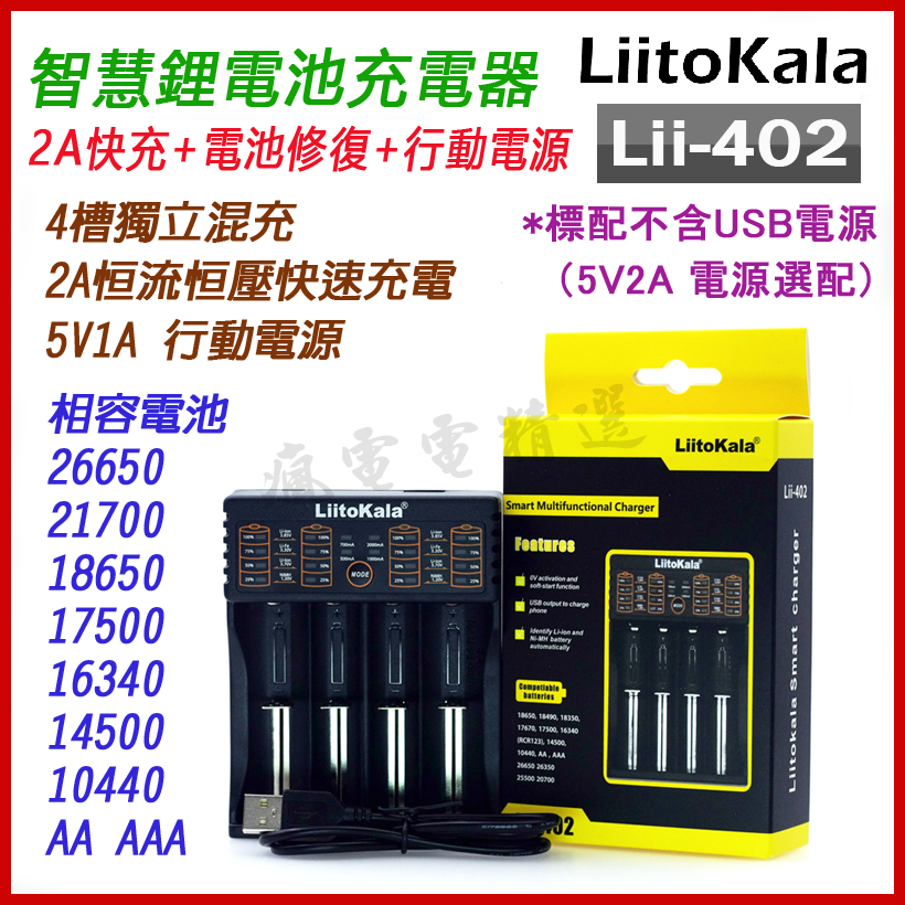 標準配置:1 * Liitokala Lii-402電池充電器, 1 * USB 線, 1* 說明書