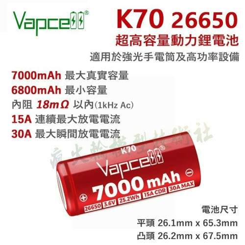 ✨✨VAPCELL K62 26650 6200mAh 平頭 動力電池 (紅皮)