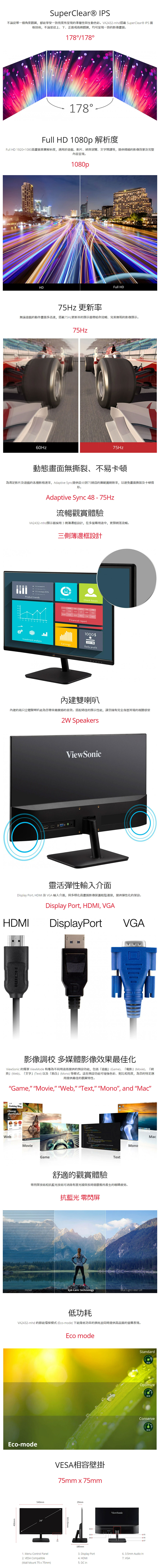 ViewSonic VA2432-mhd 是一款多功能的24吋(可視範圍23.8吋)Full HD 顯示器,具備彈性輸入介面,適用於家庭及辦公室。另外,ViewSonic VA2432-mhd支援SuperClear® IPS技術及Full HD解析度,無論從哪一個角度觀看,皆能享受清晰、生動逼真色彩且亮度一致的畫面。內建雙喇叭能夠確保音質明亮清晰,而Display Port、HDMI、VGA輸入提高與其他裝置連結的靈活彈性。此外,VA2432-mhd的三側薄邊框設計,為多顯示器配置提供近乎無縫的觀看體驗。這台顯示器提供六種預設的ViewMode選項,針對不同的應用提供最佳的螢幕表現。甚至在遊戲時,解決遊戲畫面惱人的影像撕裂。而先進的護眼技術,有助於消除長時間觀看螢幕所產生的眼睛疲勞。VESA相容型壁掛架設計,就能視需要輕鬆的將顯示器安裝於牆面上。