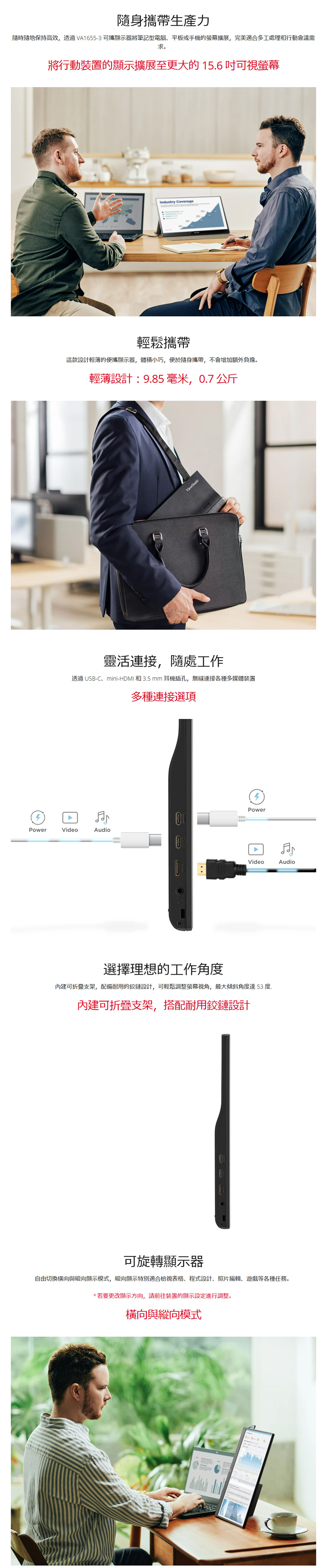 | 產品內容 | VA1655-3 x1, mini HDMI to HDMI Cable (v1.4; Male-Male) x1, USB Type-C Cable (Male-Male) x1, Quick Start Guide x1, Sleeve case x1 |