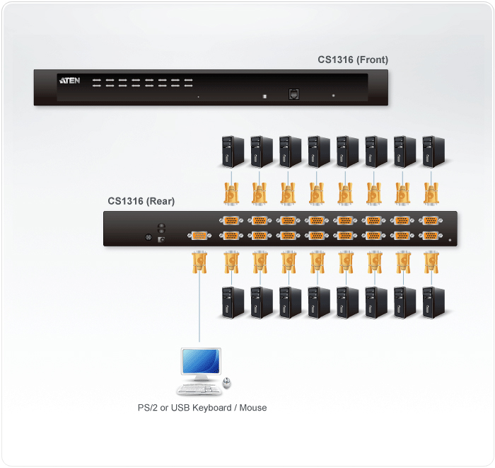 CS1316 KVM多電腦切換器具備高擴充能力,其可採用堆疊方式另外串接16台KVM多電腦切換器,並透過一組控制端(鍵盤、螢幕及滑鼠)管理多達256台電腦。CS1316在控制端及電腦端皆支援USB及PS/2雙介面。
