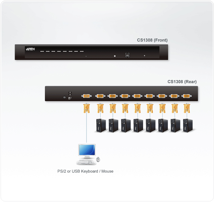 CS1308 KVM多電腦切換器具備高擴充能力,其可採用堆疊方式另外串接8台KVM多電腦切換器,並透過一組控制端(鍵盤、螢幕及滑鼠)管理多達64台電腦。CS1308在控制端及電腦端皆支援USB及PS/2雙介面。