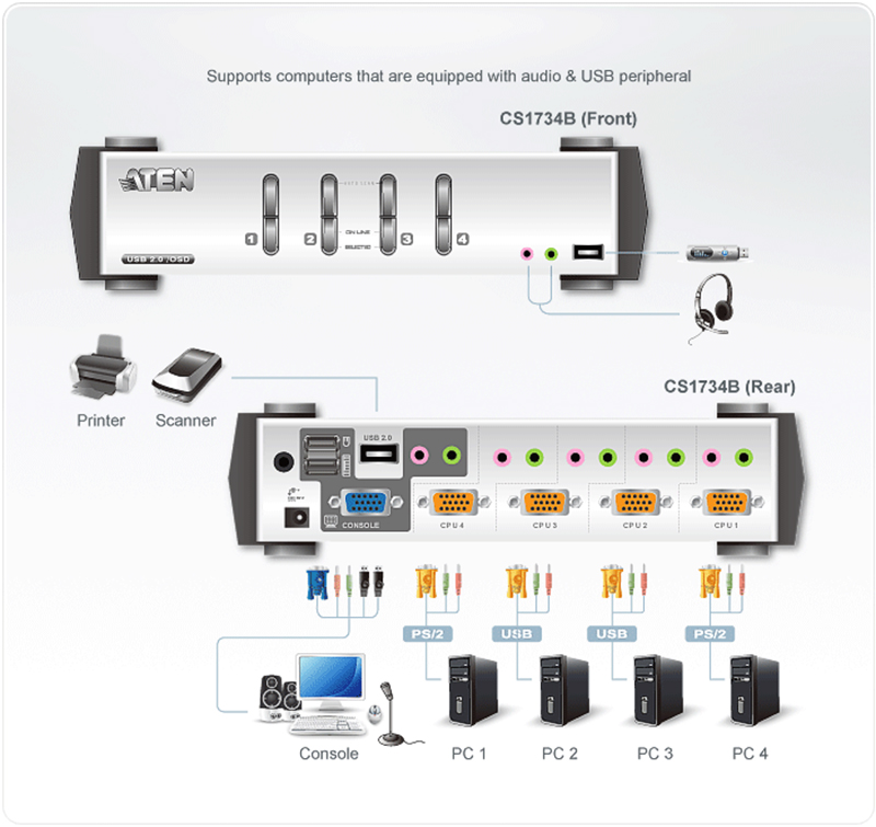 ATEN CS1734B 4埠PS/2-USB VGA/音訊 KVMP™多電腦切換器(具備OSD功能)