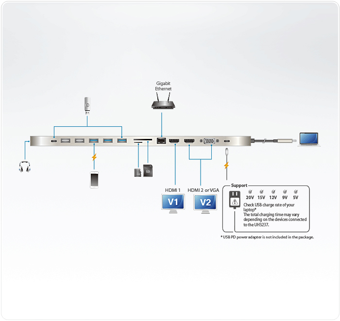 ATEN UH3237 USB-C多埠充電擴充基座體積輕薄,可連接您所需之各種額外裝置,一個步驟輕鬆升級您的筆記型電腦;UH3237使用一條纜線即可外接多達13項週邊設備,同時帶有電力傳輸功能,透過外接HDMI、VGA、USB 3.2 Gen 1/USB 2.0、SD / MicroSD、乙太網路及音訊裝置等來提升生產力。