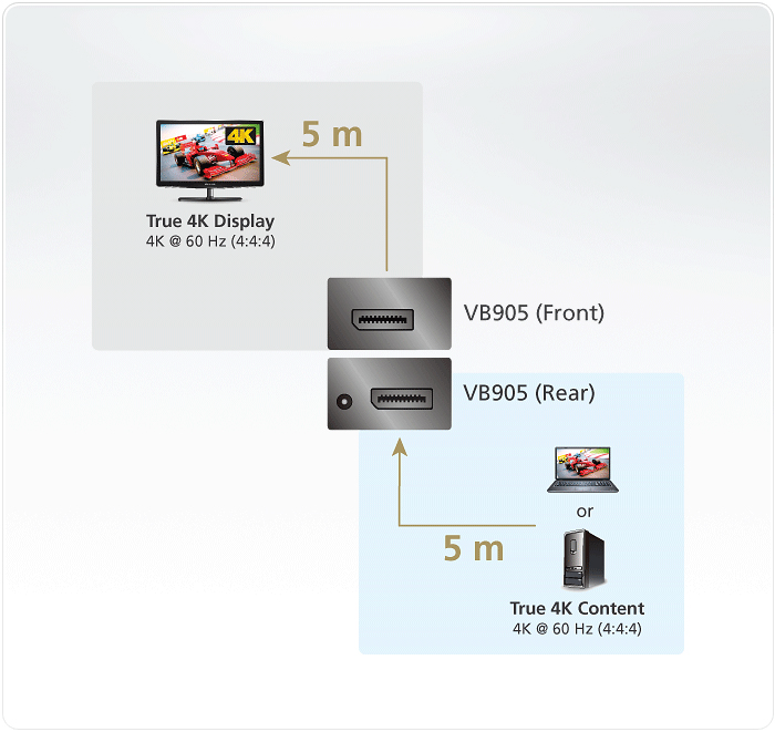 ATEN VB905能將True 4k訊號從來源端至顯示裝置無失真地延伸高達5公尺。針對需要長距離傳輸的應用,最多可串聯 3 層 (20公尺),並確保色彩及畫質呈現最佳效果。