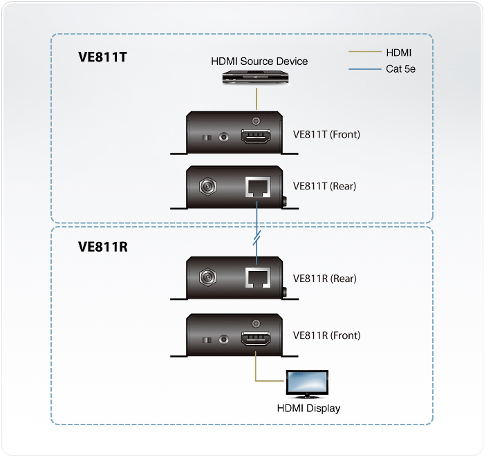 VE811R 為一款HDMI HDBaseT接收器可延伸HDMI 訊號達100 公尺,所支援HDMI 規格包含3D、色深、無失真音訊和消費電子控制(CEC)。在音效及影像方面,VE811 支援杜比數位音效5.1 和DTS 音效,影像解析度可達4K。