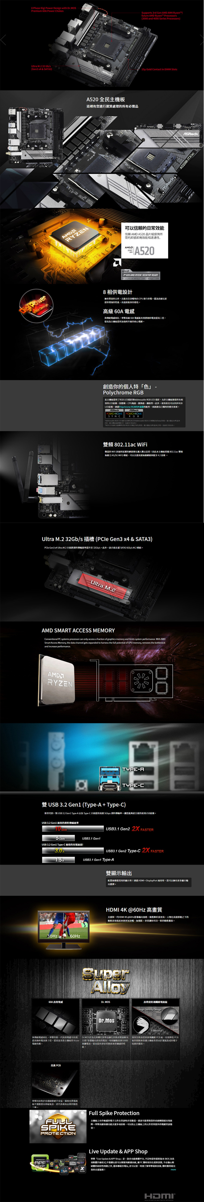 | 處理器 | - 支持AMD AM4插槽Ryzen™3000、4000 G系列和5000系列處理器* - 數位電源設計 - 8 電源相位設計 *不相容 AMD Ryzen™ 5 3400G 和 Ryzen™ 3 3200G.D11' |