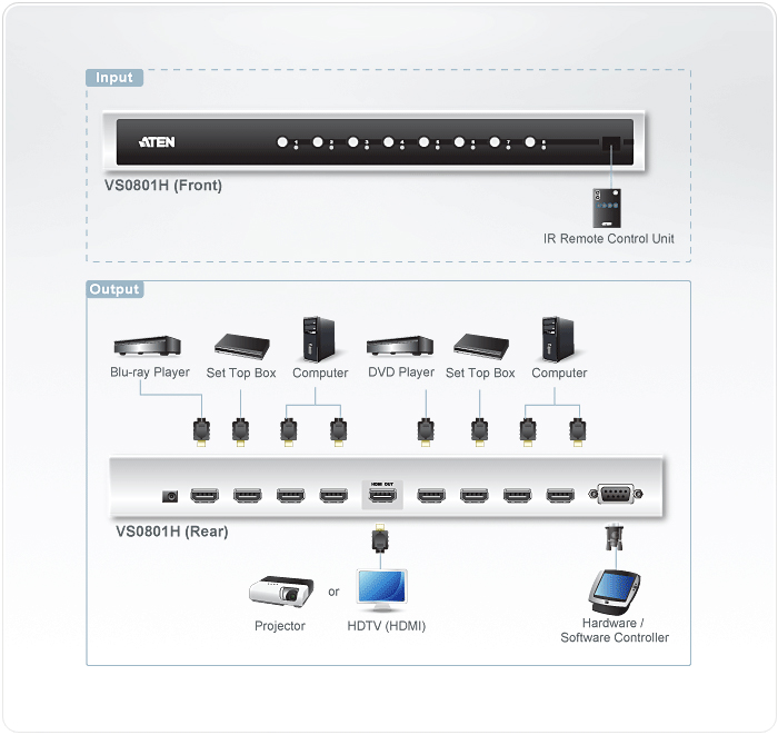 使用者可以透過VS0801H的專屬遙控器與方便的前端面板按鍵,快速且輕鬆的在HDMI訊號來源間進行切換,同時,其前端面板LED指示燈會顯示訊號來源設備的狀態。此外,對於完整的系統與設備整合,透過VS0801H內建的雙向RS-232序列遠端連接埠,用戶可以採用高階控制器、PC、及/或家庭自動化/家庭劇院軟體控制VS0801H切換器。