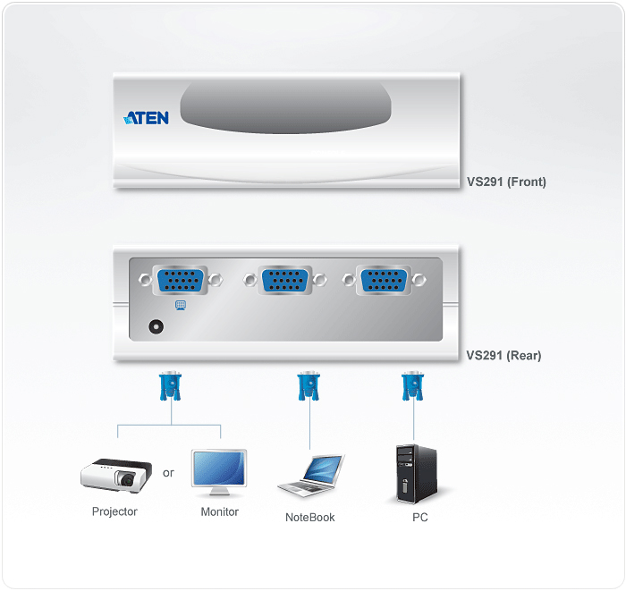 ATEN VS291視訊切換器可讓2台獨立的VGA訊號輸出至一個LCD螢幕上,或輸出至多媒體投影機,投射到螢幕上! 使用者可使用前端面板按鍵,輕鬆快速的切換選擇訊號源。V291 2埠視訊切換器是企業簡報及學校授課應用環境最輕鬆的解決方案。
