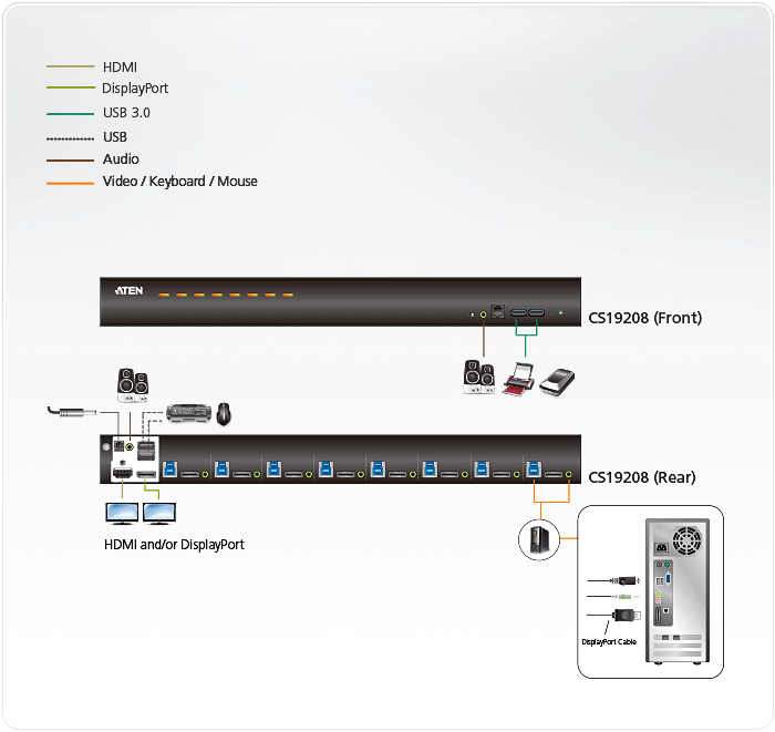 ATEN CS19208 8埠USB 3.0 4K DisplayPort KVM多電腦切換器透過一組USB鍵盤、USB滑鼠和螢幕控制端,可有效率地存取和控制多達8台DisplayPort電腦。其控制端配備雙影像介面,使用者可選擇DisplayPort或HDMI視訊輸出,解析度高達4K DCI(4096 x 2160 @ 60Hz),呈現清晰的視覺效果。