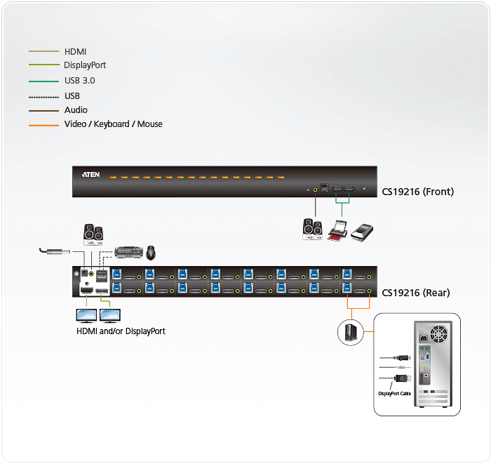 ATEN CS19216 16埠USB 3.0 4K DisplayPort KVM多電腦切換器透過一組USB鍵盤、USB滑鼠和螢幕控制端,可有效率地存取和控制多達16台DisplayPort電腦。其控制端配備雙影像介面,使用者可選擇DisplayPort或HDMI視訊輸出,解析度高達4K DCI(4096 x 2160 @ 60Hz),呈現清晰的視覺效果。