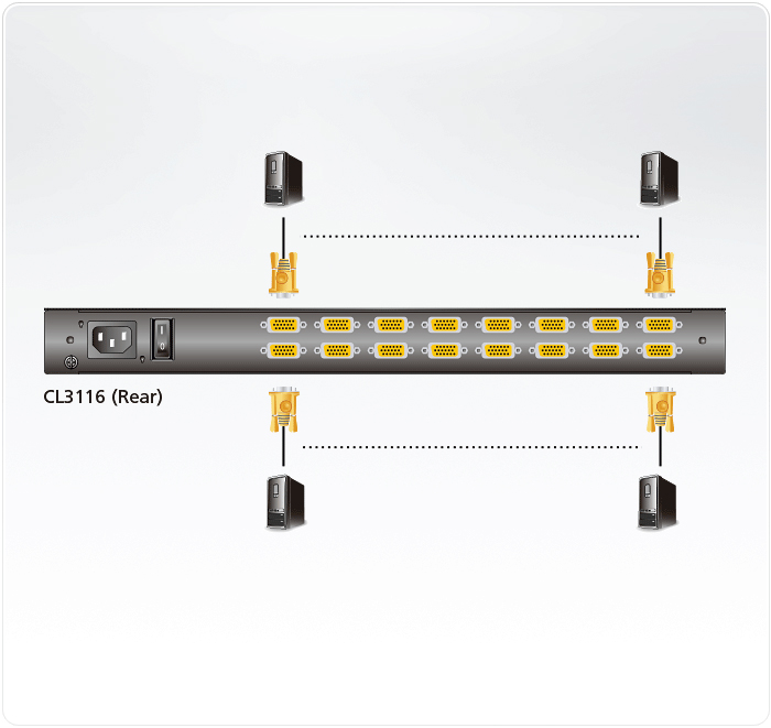 單一CL3116最多可控制16台電腦; 串接16個額外的KVM多電腦切換器後, 單一CL3116 LCD KVM多電腦切換器可以控制多達256台電腦。為了達到更高的操作效率,CL3116提供廣播模式,可從控制端將指令同時傳送至所有伺服器執行。另外,自動掃描模式可持續監控特定電腦群,為使用者打造可靠的工作環境。