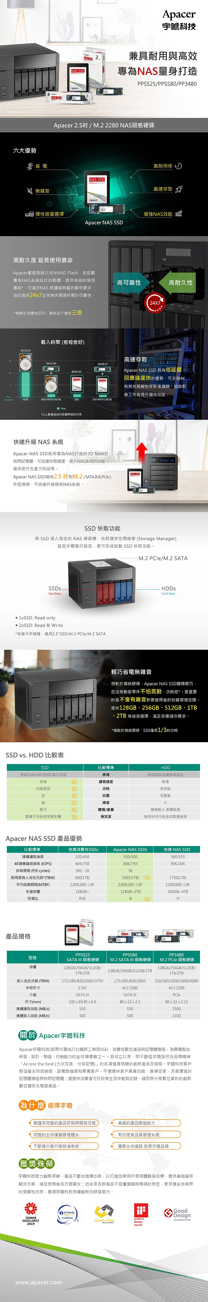 Apacer NAS SSD採用專為NAS打造的3D NAND快閃記憶體,可加速存取速度、提升NAS系統的效能,進而提升生產力和效率。