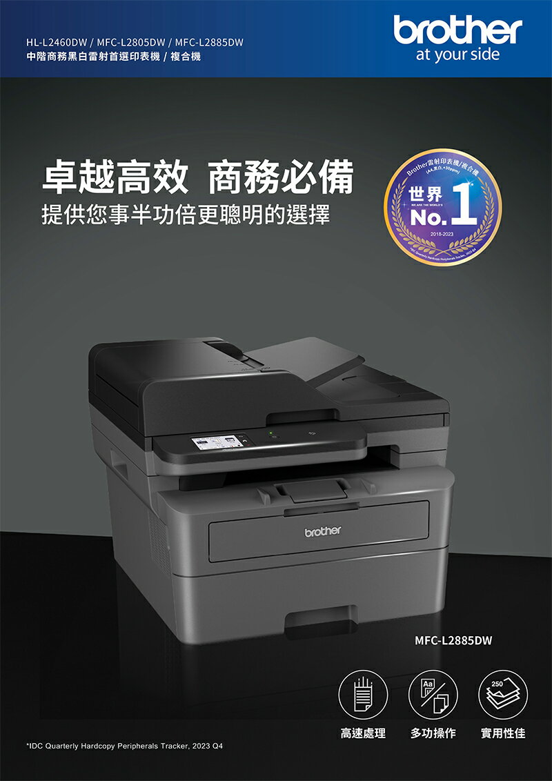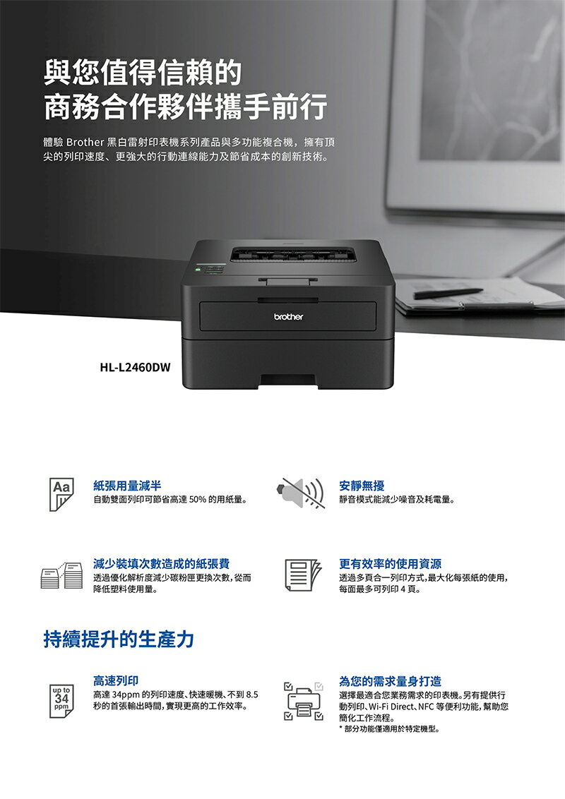 *此優惠組內容包含 HL-L2460DW 印表機 和 TN-2560XL 原廠高容碳粉匣