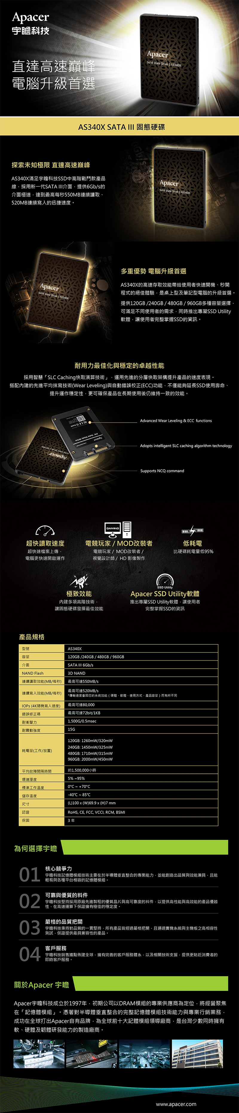 AS340X的高速存取效能帶給使用者快速開機、秒開程式的絕佳體驗,是桌上型及筆記型電鮥的升級首選。提供120GB/240GB/480GB/960GB多種容量選擇,可滿足不同使用者的需求,同時推出專屬SSD Utility軟體,讓使用者完整掌握SSD的資訊。