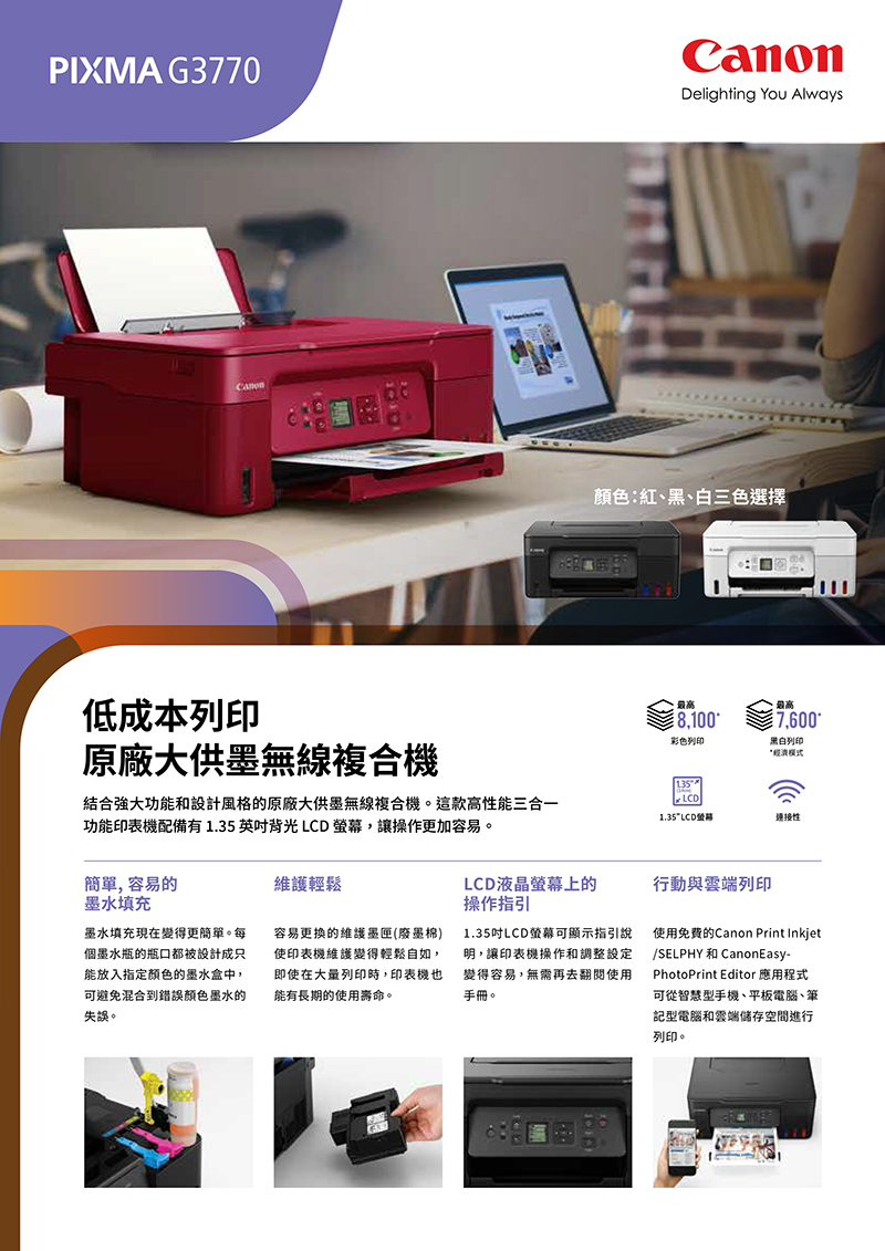 集合強大功能和時尚設計的原廠大供墨無線複合機。這款高性能三合一功能印表機配備1.35吋背光 LCD螢幕,讓印表機操作更加輕鬆。