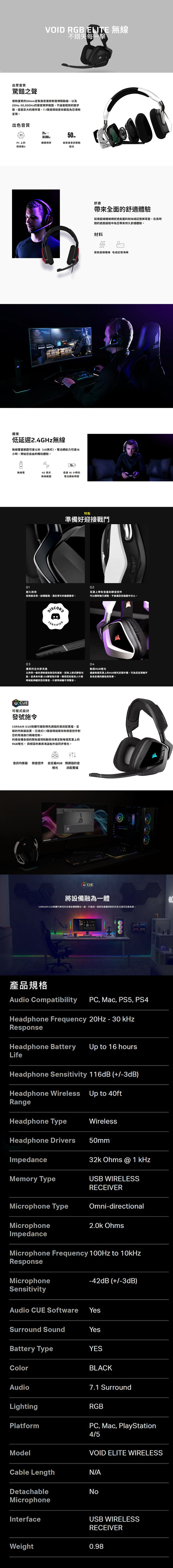 海盜船 Corsair VOID RGB ELITE WIRELESS 無線電競耳機麥克風【黑】