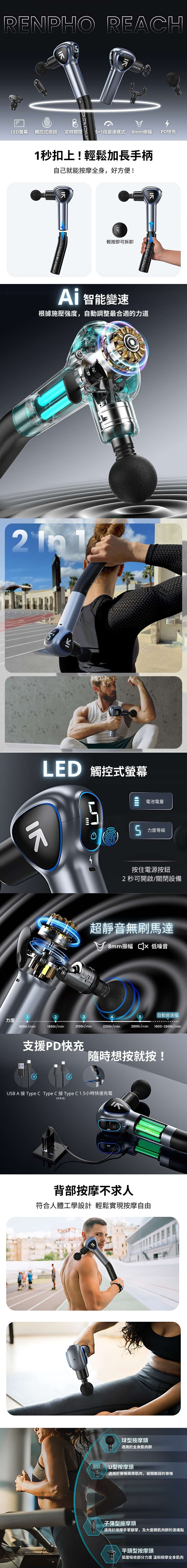 (1)可拆卸加長防滑手柄:人體工學設計, 既是迷你按摩槍,也是加長按摩槍,輕鬆按摩背部和難以到達的區域