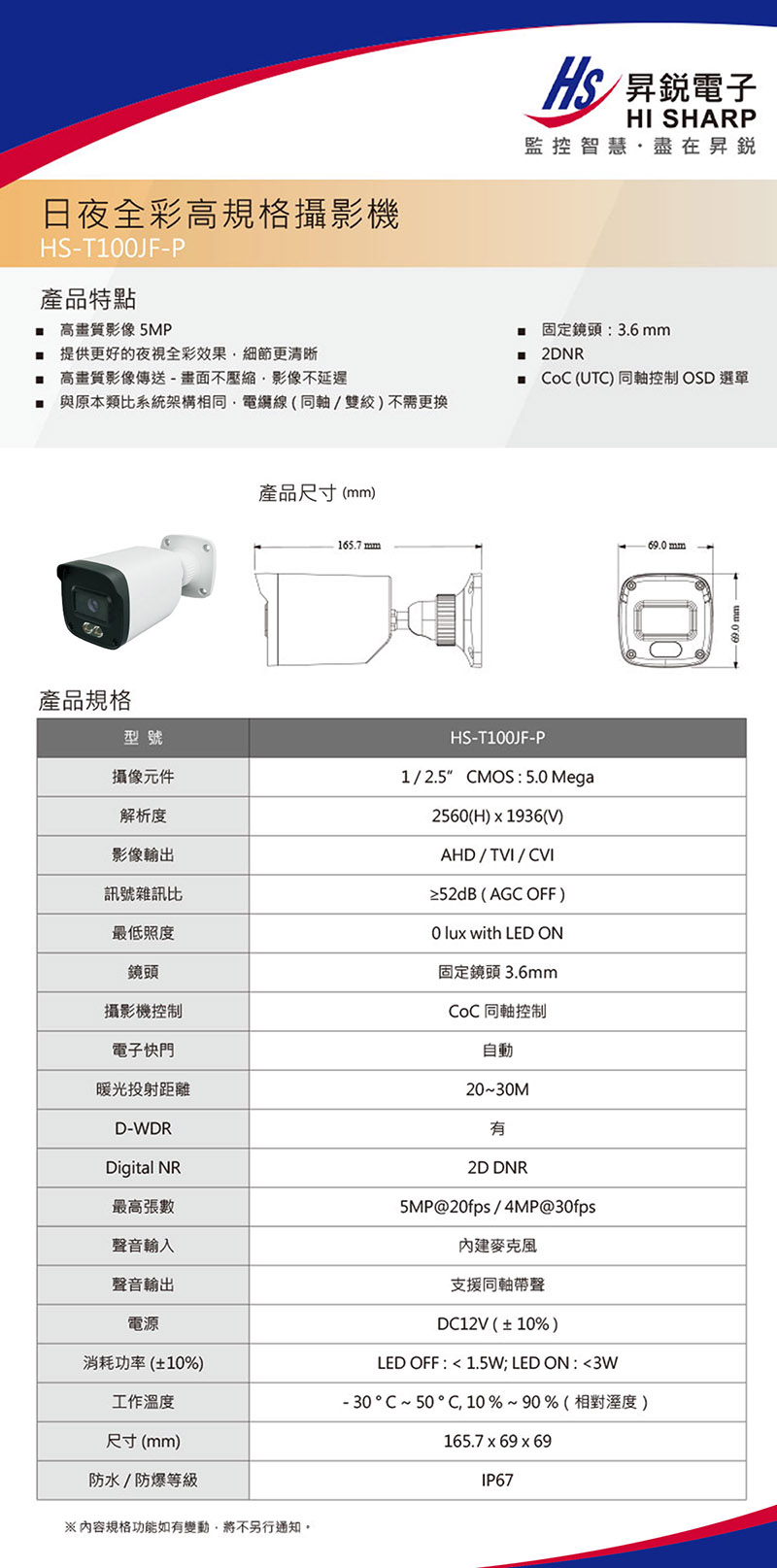 HI SHARP 昇銳HS-T100JF-P日夜全彩攝影機