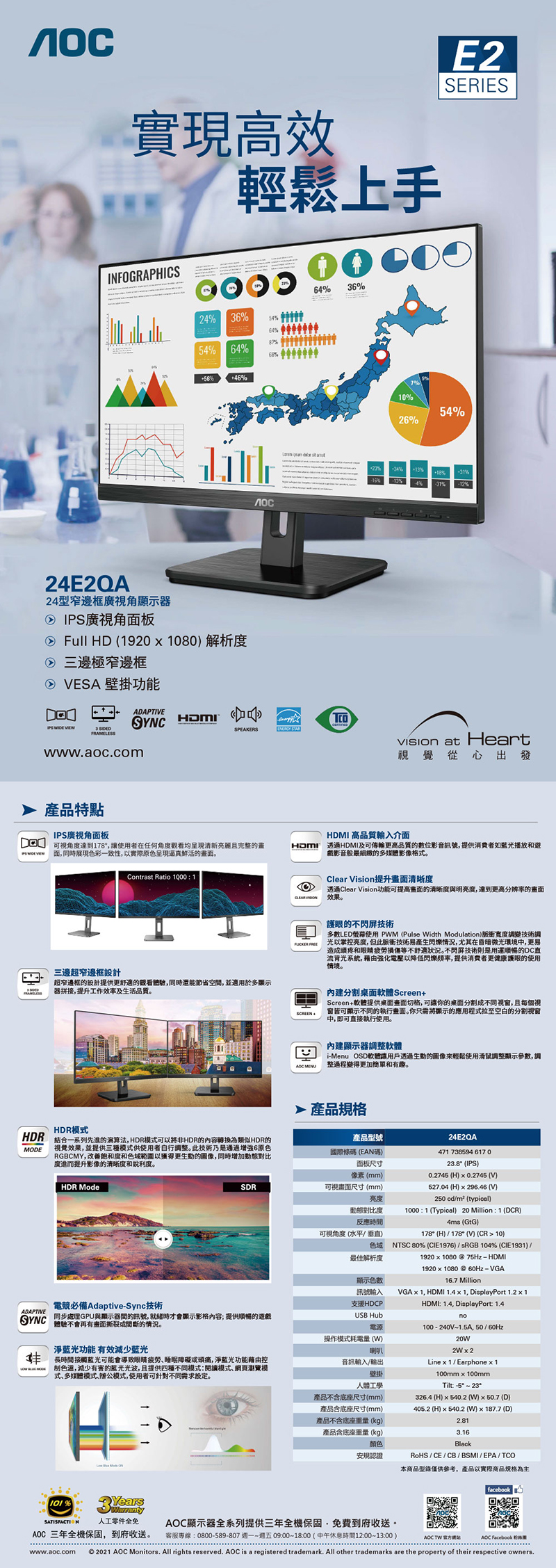 24E2QA為23.8吋FHD (1920 x 1080 @100Hz)顯示器,配備VESA壁掛功能,使用者可根據空間更加靈活的設置顯示器。採用IPS廣視角面板,可視角度達到178°,展現色彩一致性,以實際原色呈現逼真鮮活的畫面。HDR模式提供三種模式供使用者自行調整,通過增強6原色RGBCMY,改善飽和度和色域範圍以獲得更生動的圖像,同時增加動態對比度進而提升影像的清晰度和銳利度。搭載Adaptive-Sync技術、100Hz更新頻率及4ms反應時間,提供流暢的使用體驗,不會再有畫面撕裂或間斷的情況,讓畫面一舉一動都清晰無比。