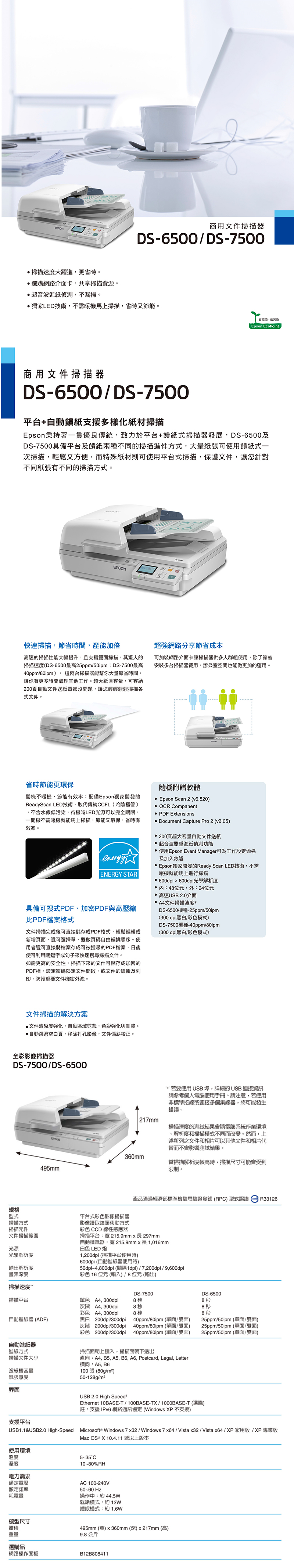 Epson秉持著一貫優良傳統,致力於平台+饋紙式掃描器發展,DS-7500具備平台及饋紙兩種不同的掃描進件方式,大量紙張可使用饋紙式一次掃描,輕鬆又方便,而特殊紙材則可使用平台是掃描,保護文件,讓您針對不同紙張有不同的掃描方式。