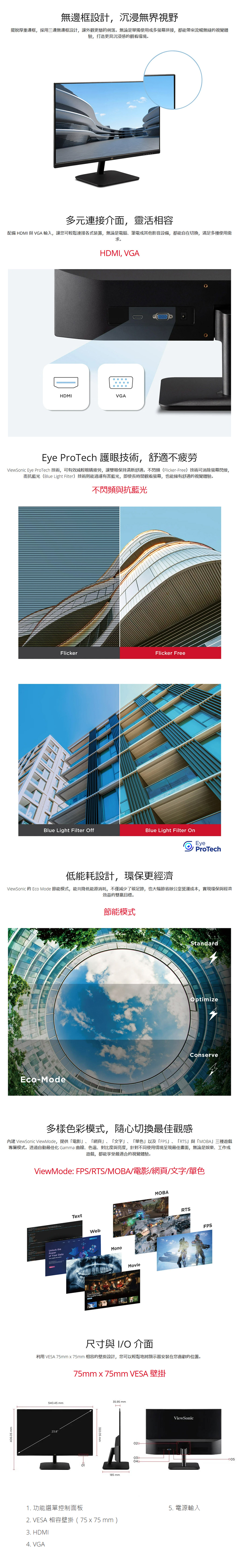 ViewSonic VA2432-H-2 是一款 24 吋 Full HD IPS 顯示器,配備 HDMI 和 VGA 輸入,適合商務與家用。透過可變刷新率 (VRR)、Eye ProTech 護眼技術和多種 ViewMode 預設模式,提供最佳的螢幕效能、最舒適的觀看體驗,畫面無撕裂或卡頓。VA2432-H-2 支援 VESA 壁掛,並具備低功耗特性,讓您輕鬆擴展工作空間,在單一螢幕上體驗流暢的多工處理。