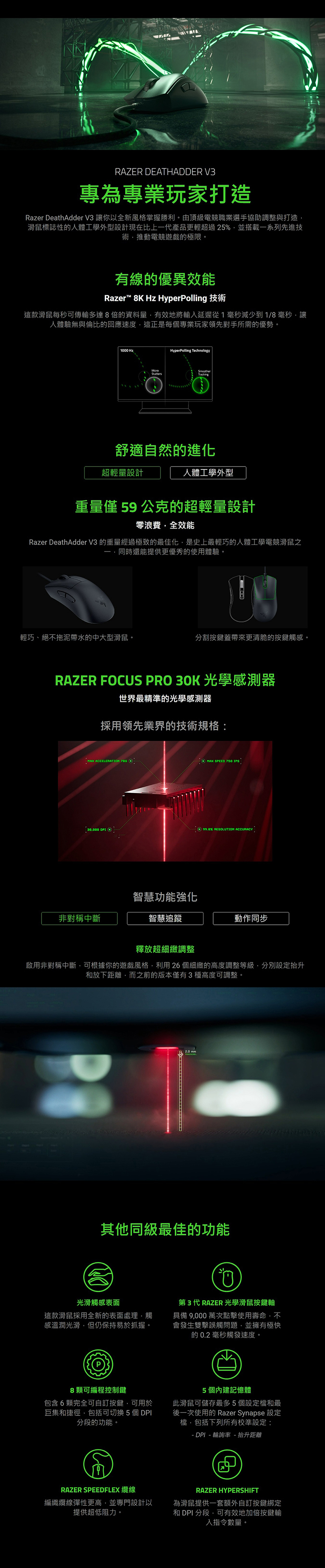 Razer DeathAdder V3 讓你以全新風格掌握勝利。由頂級電競職業選手協助調整與打造,滑鼠標誌性的人體工學外型設計現在比上一代產品更輕超過 25%,並搭載一系列先進技術,推動電競遊戲的極限。