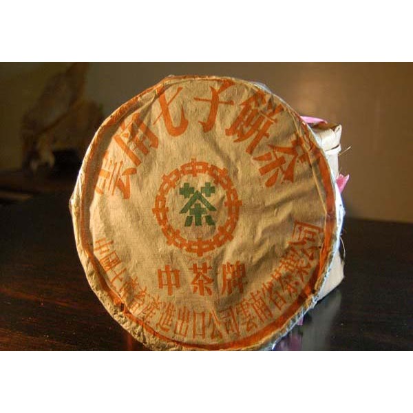 3. 外包裝中央印有八中茶商標與「中茶牌」字樣,上方印有「雲南七子餅茶」品名,下方印有「中國土產畜產進出口公司雲南省茶業公司」字樣。