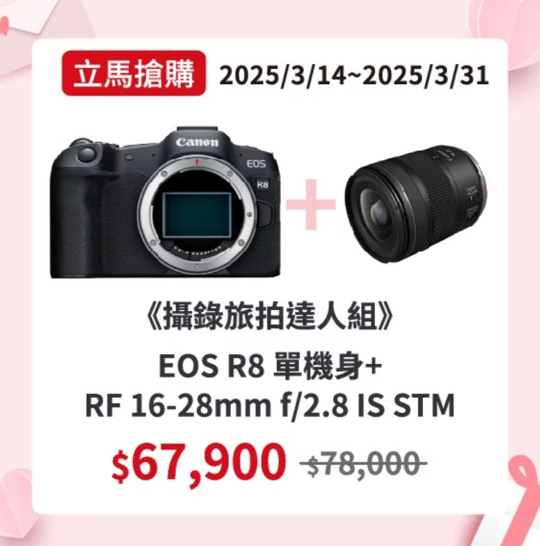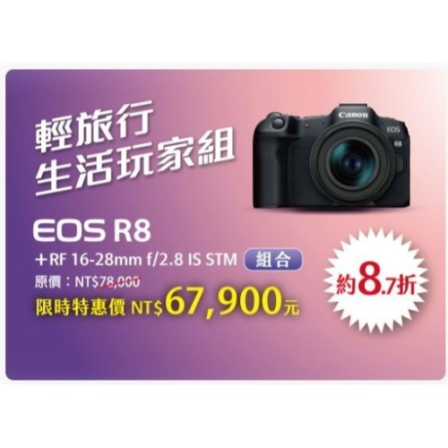 [5/1-6/30特惠價] CANON EOS R8 +RF16-28mm f/2.8 IS STM輕旅行玩家組