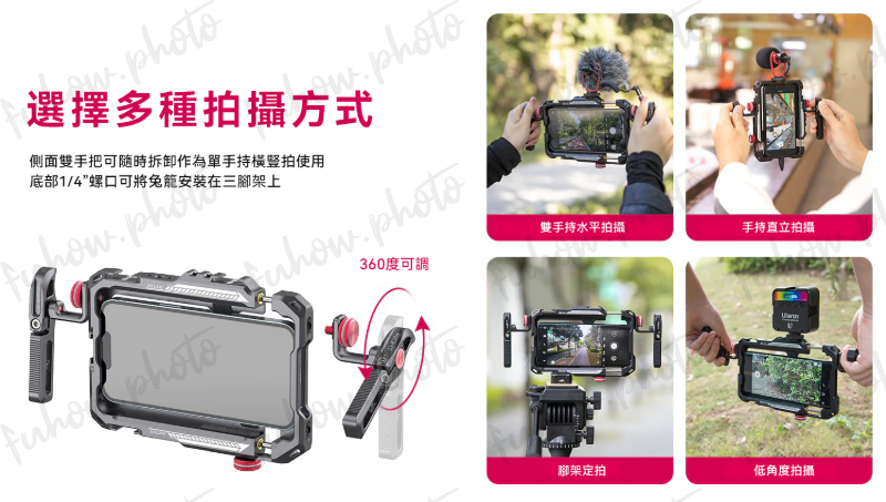 Ulanzi Lino Metal Cage 是一款適用於 iPhone X、11、12 和 13 等多種手機的多功能兔籠。使用堅固的夾座和旋鈕將手機固定。 雙手把設計讓您在製作影片或微電影時更加穩定。將手把連接到任何您想要的1/4"螺口。 安裝後,手把可以 360° 旋轉,因此您可以從任何角度進行拍攝。透過通用的1/4"螺絲和四個冷靴座,讓您有多種選擇來安裝補光燈、麥克風等配件 .