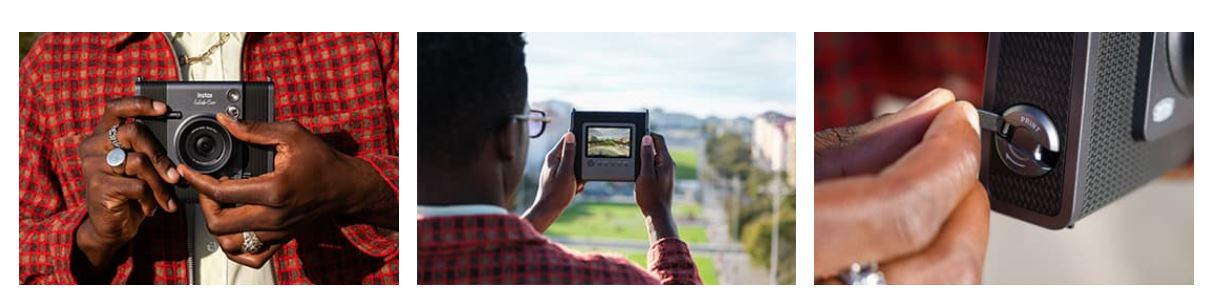 相機外殼採用奢華設計,結合黑色基底與金屬材質,並搭配類比操作方式,例如透過轉盤選擇效果或扳動「列印撥桿」列印照片,讓使用者享受創作寬幅 instax™ 列印照片的樂趣。