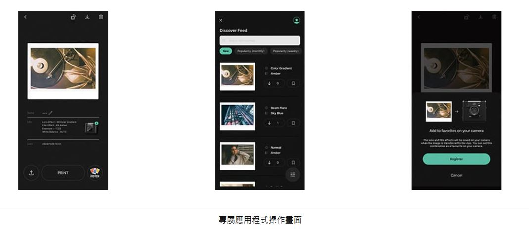 - 「發現動態」功能:專屬應用程式內建「發現動態」功能,讓全球「WIDE Evo」用戶可瀏覽社群媒體上分享的 instax™ 列印照片及其所使用的拍攝效果,為創作帶來新靈感。