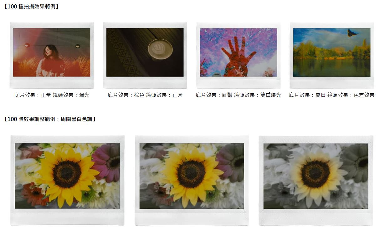它提供 10 種鏡頭效果(如「洋紅」、「黑白」)和 10 種相紙效果(如「漏光」、「漸層色彩」),兩種效果可自由結合,創造出 100 種拍攝效果。更首次在 instax™ 系列中引入「效果強度調整」功能,使用者可以精細調節光線強度和色彩漸層,達到 100 階調整,實現精緻且精確的拍攝表現。