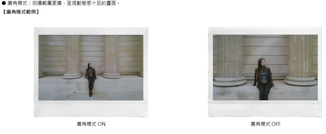 此外,「底片風格」功能為照片添加具有底片特色的邊框,增強照片的吸引力;「廣角模式」則讓拍攝範圍更廣,展現更具動態感的寬幅照片。