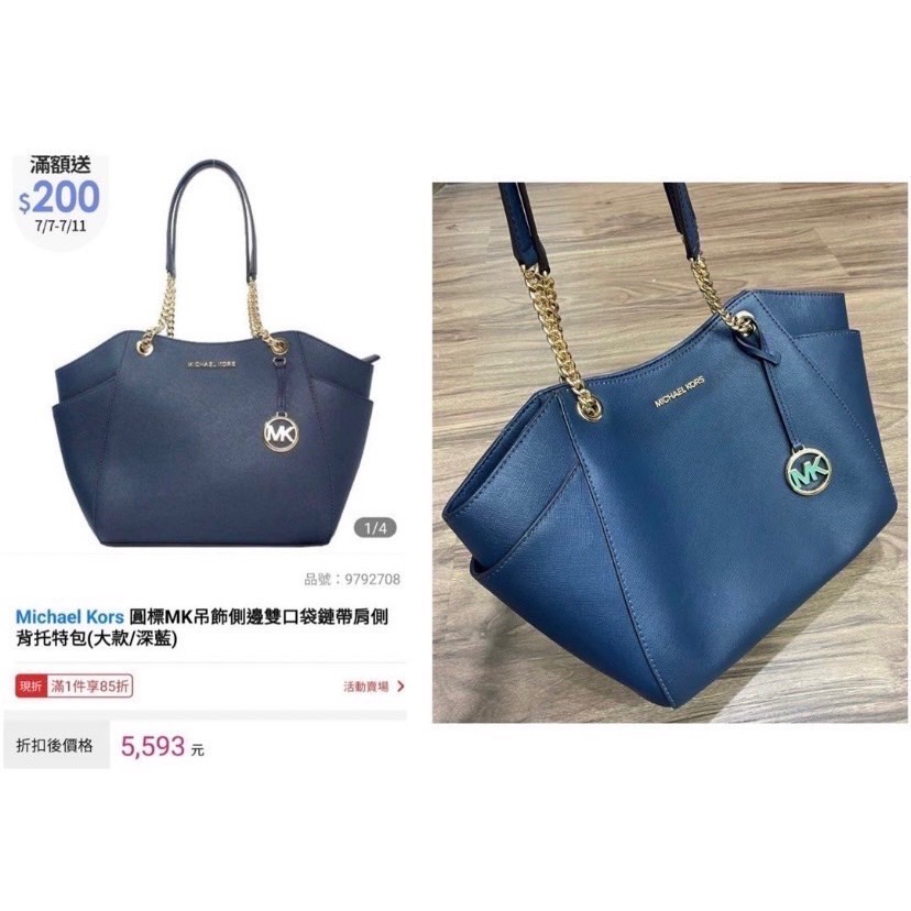 正品Michael Kors圓標MK吊飾防刮皮革鏈包 肩側背托特包(大款/深藍)