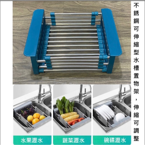 全新不銹鋼可伸縮型水槽置物架(伸縮水槽置物 瀝水藍 ☆ 蔬果瀝水架)藍色