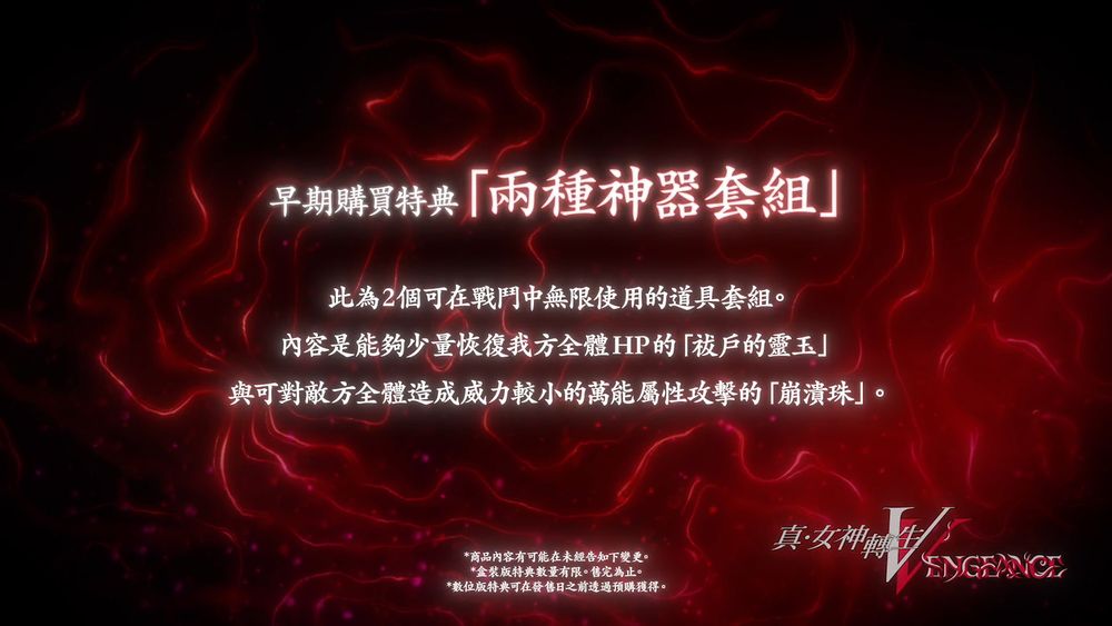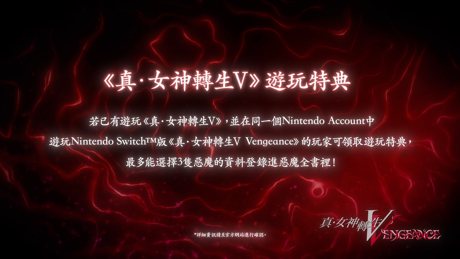 若已有遊玩《真‧女神轉生 V》,並在同一個 Nintendo Account 中遊玩 Nintendo Switch 版《真‧女神轉生 V Vengeance》的玩家可領取遊玩特典,最多能選擇 3 隻惡魔的資料登錄進本作的惡魔全書裡。