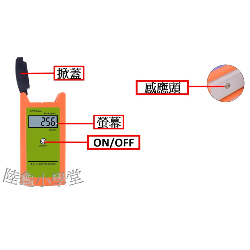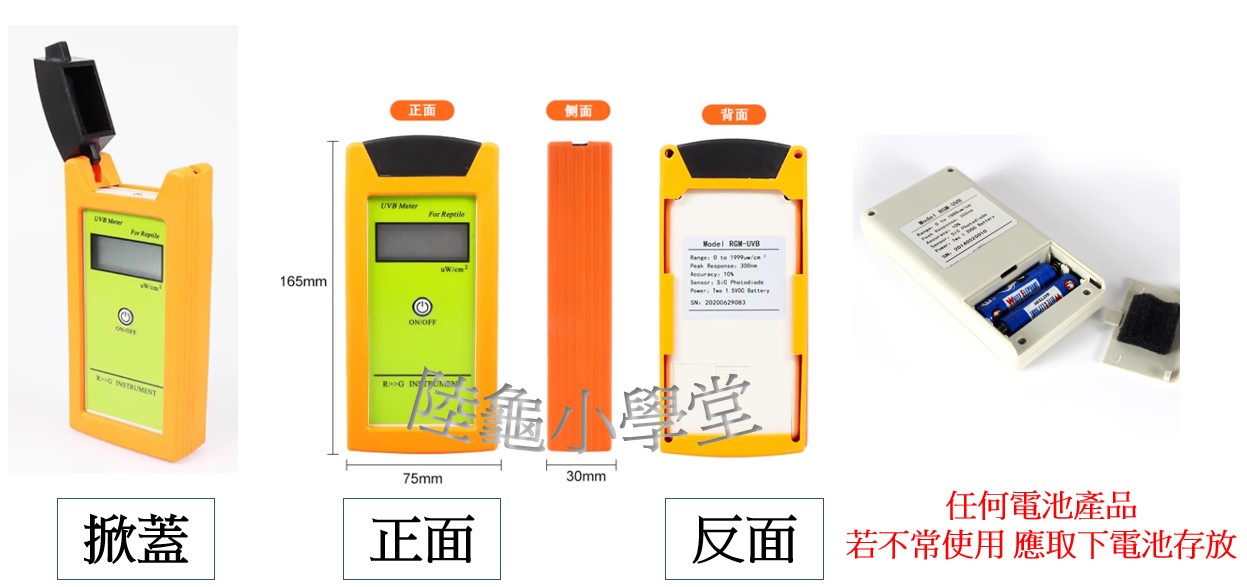 將傳感器對準UVB光源,按壓正面按鈕,即可顯示UVB強度
