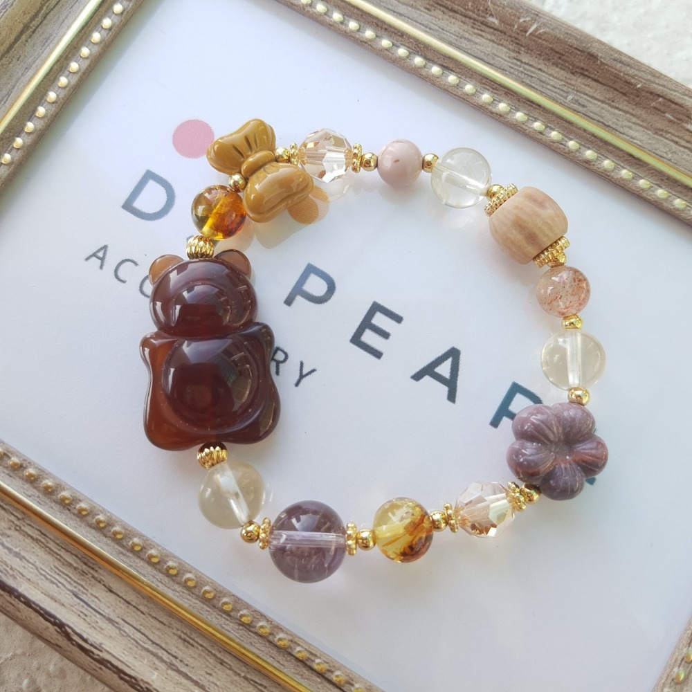 材質:蜜蠟布偶熊、阿拉善、花珀、黃水晶、紫水晶