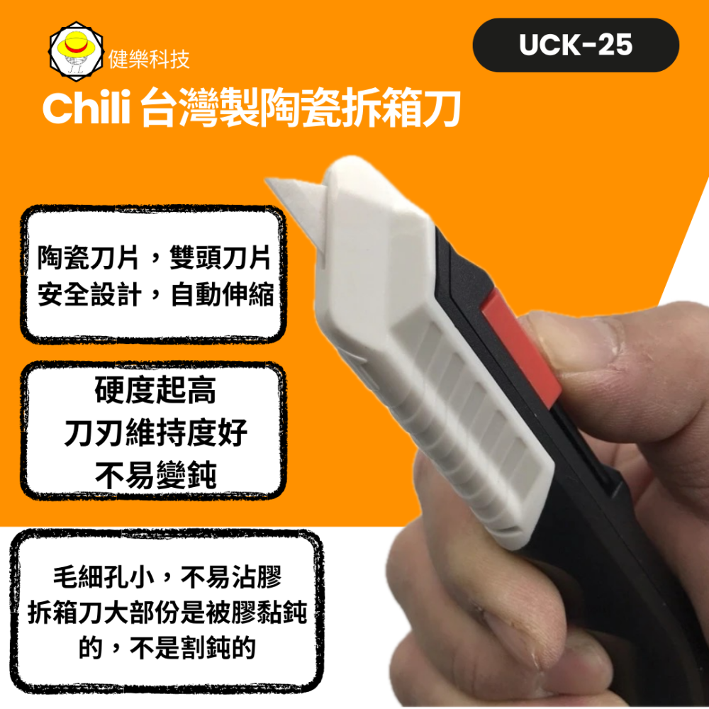 銳利的陶瓷刀片可以輕鬆的割開紙箱,雙頭都可使用。高硬度的陶瓷刀,刀刃的維持度較傳統的刀片好很多很多,加上陶瓷刀的毛細孔非常的小,膠帶上的膠不易附著,可以長時間維持銳利感。人體工學握把,圓潤不刮手。刀柄尾部設計的轉折,可以勾住口袋,方便取出 。