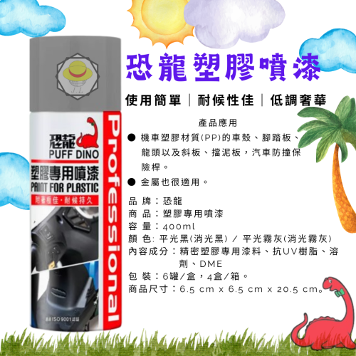 恐龍塑膠專用噴漆使用符合RoHS標準的原料,安全無毒,對塑膠材質附著力非常好。針對車輛所需的顏色調配,就像換新的腳踏板、擋板、塑膠蓋板及保險桿,輕鬆還給機車及汽車全新的美麗。