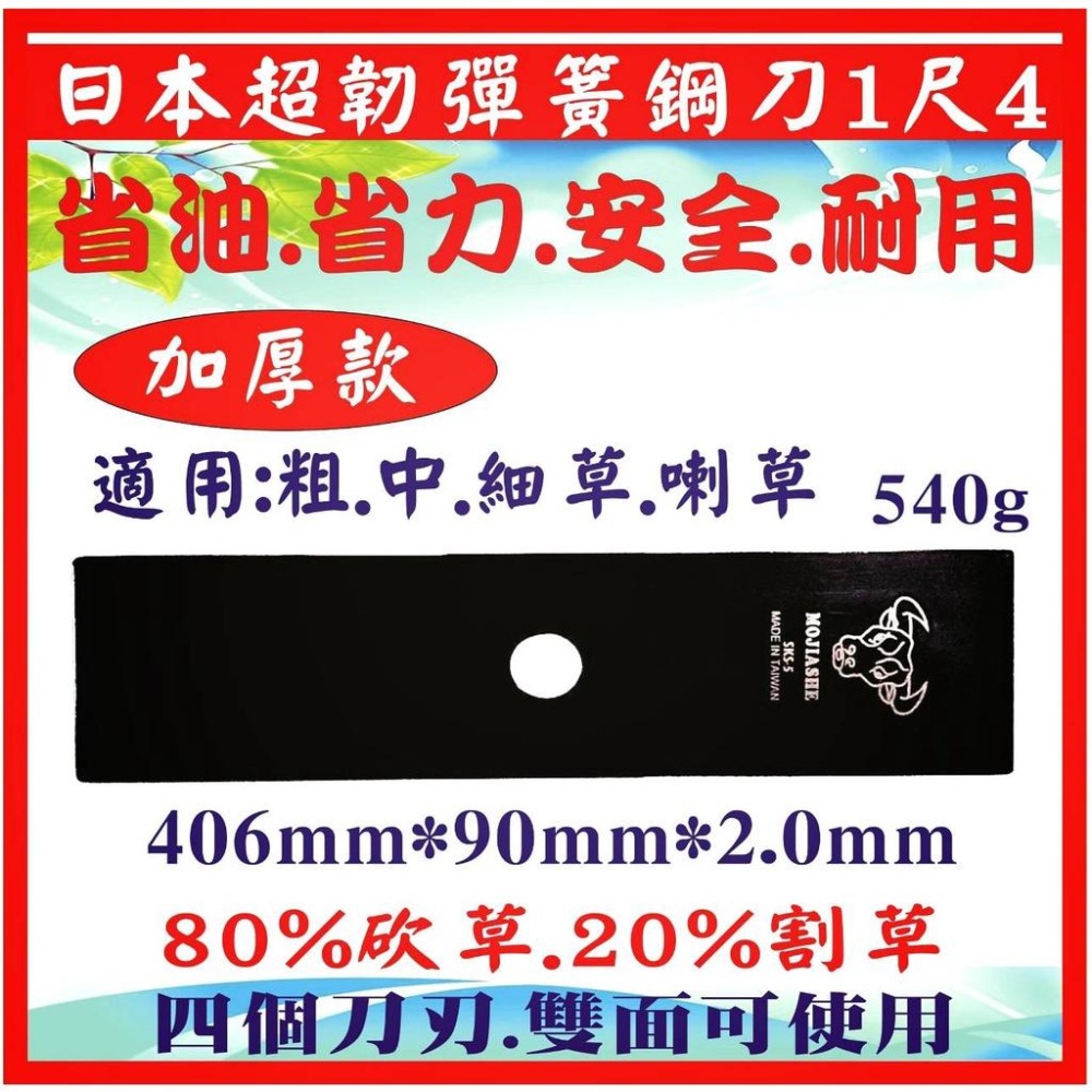 ⭐ 優惠買5片免運 ⭐ 10片送2片免運  ⭐ 💯 堅持好品質~品質有保證 ⭐ 請認明牛頭牌商標 正品公司貨 🔔【加厚款牛頭牌日本超韌彈簧鋼刀-1尺4】 ⭐【商品簡介】 經由高溫熱處理 再經多段回火到指定安全硬度 再回二廠作T3,T4,T6多段應力處理 品質符合國際標準 突破市面販售達不到的品質 和做法增長耐用度 並開發因地形 . 地物 省油省力~輕鬆輕巧 為導向專用的刀~提高效率 🔔【商品規格】 ⭐品名:加厚款牛頭牌日本超韌彈簧鋼刀-1尺4 ■ 尺寸:406mm*90mm*2.0mm ■ 材質:日本SKS-5超韌特殊彈簧鋼 ■ 孔徑 25.4mm通用規格 ■ 不限廠牌.機型.背負式.引擎割草機都可安裝 🔔【商品特色】 ■ 刀不晃 力道十足 ■ 省油、省力、又輕巧 ■ 四個刀刃、刀片雙面可使用 ■ 粗.中.細草.喇草皆適用