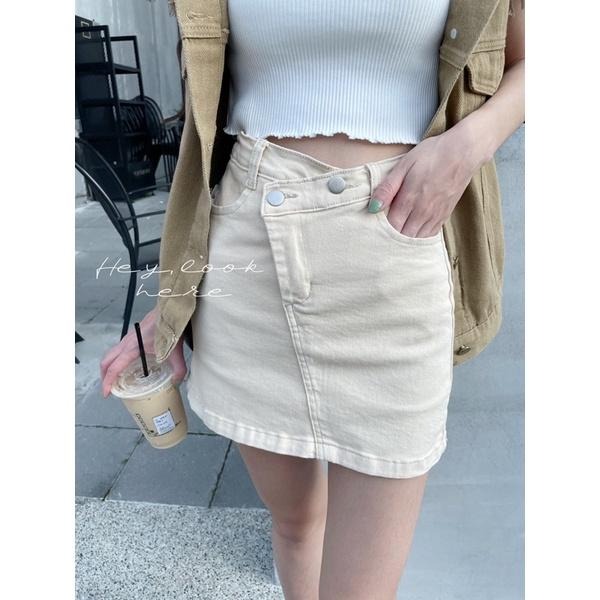 Hey, look here ✓顯瘦大推腰瘦款 奶油杏交叉造型不規則褲頭兩釦高腰牛仔褲裙/牛仔短裙