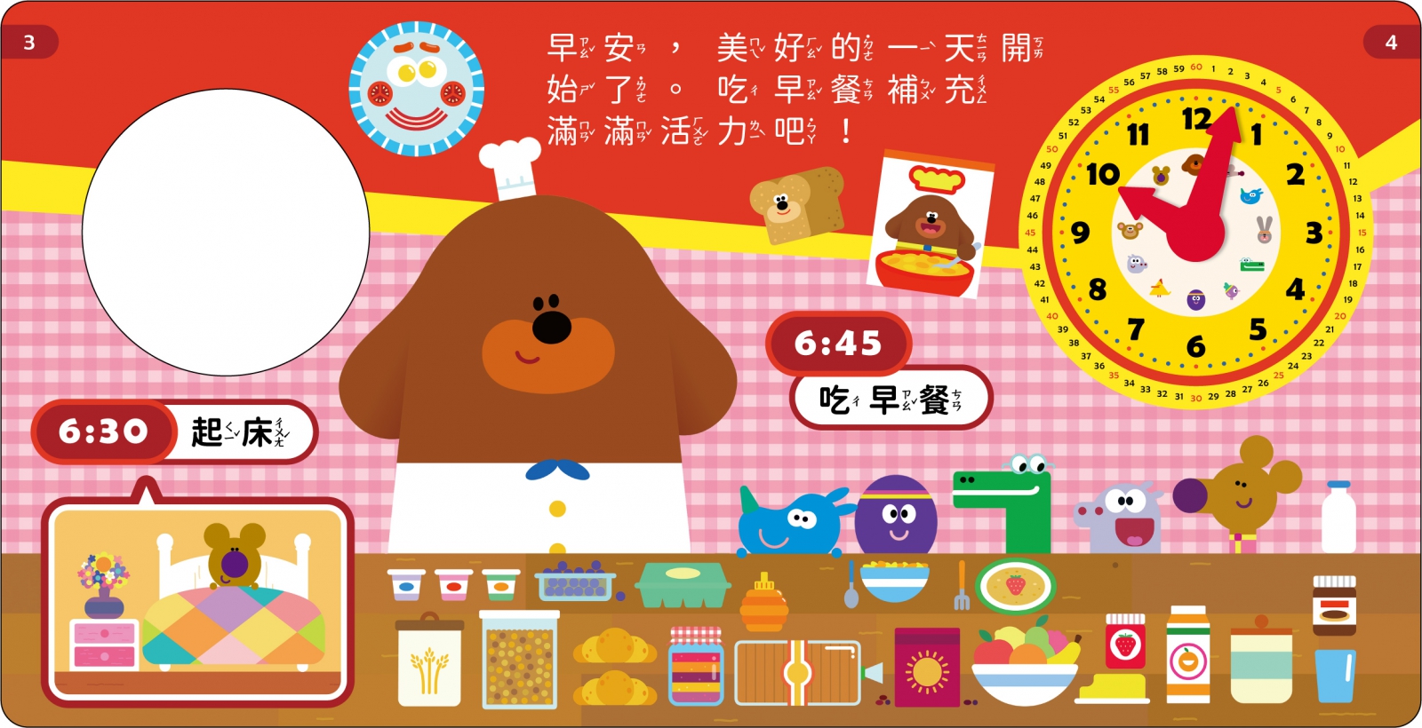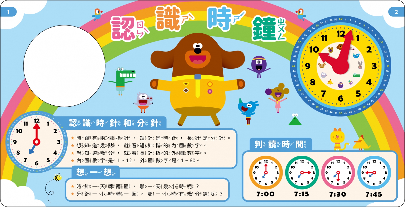 一邊認時間,一邊順向轉動書上的時鐘指針,和小朋友們一起學會看懂時鐘代表的時間!