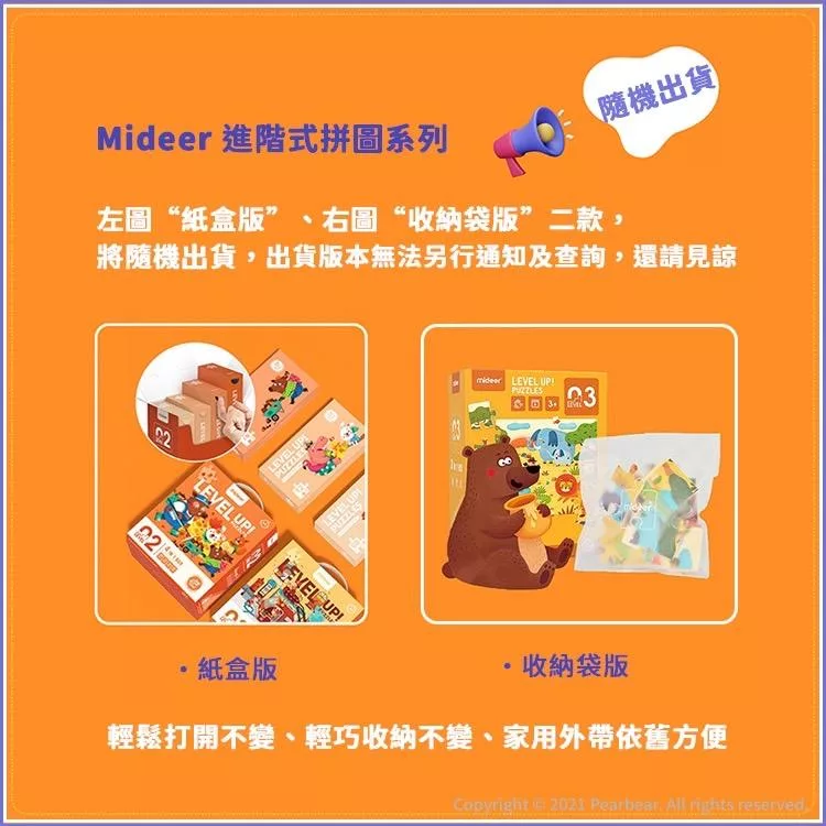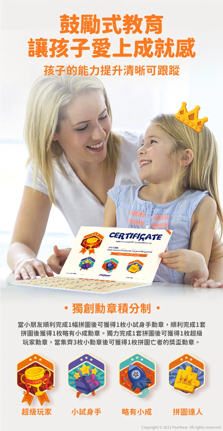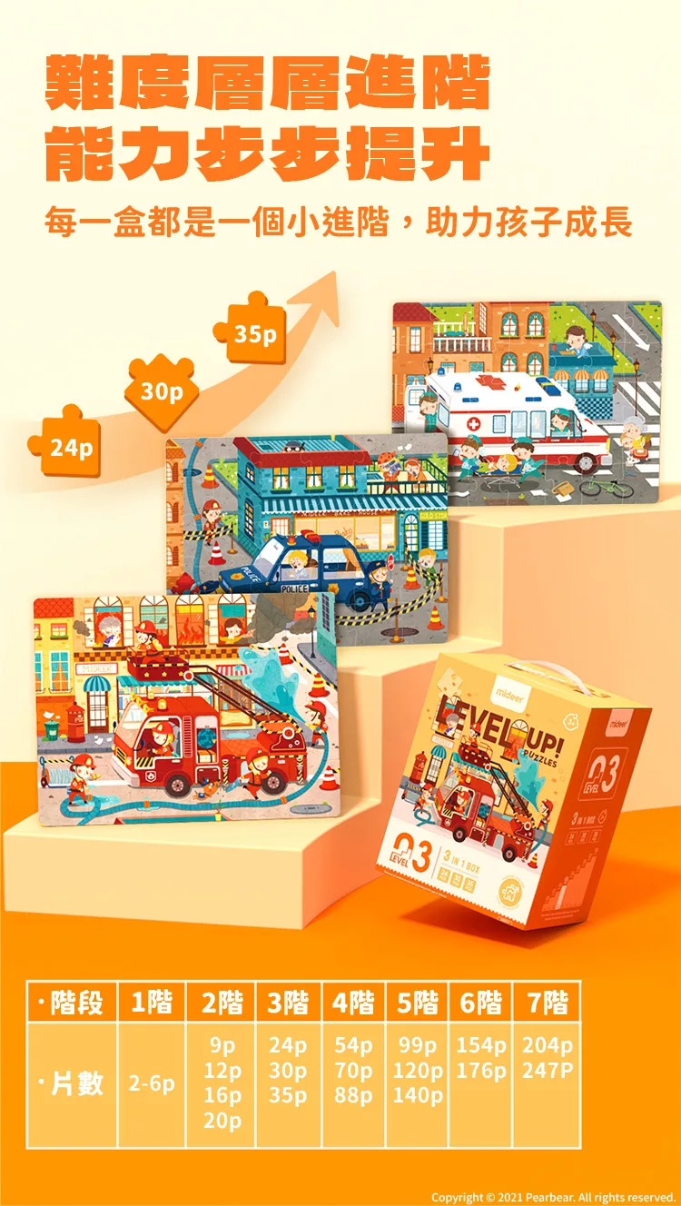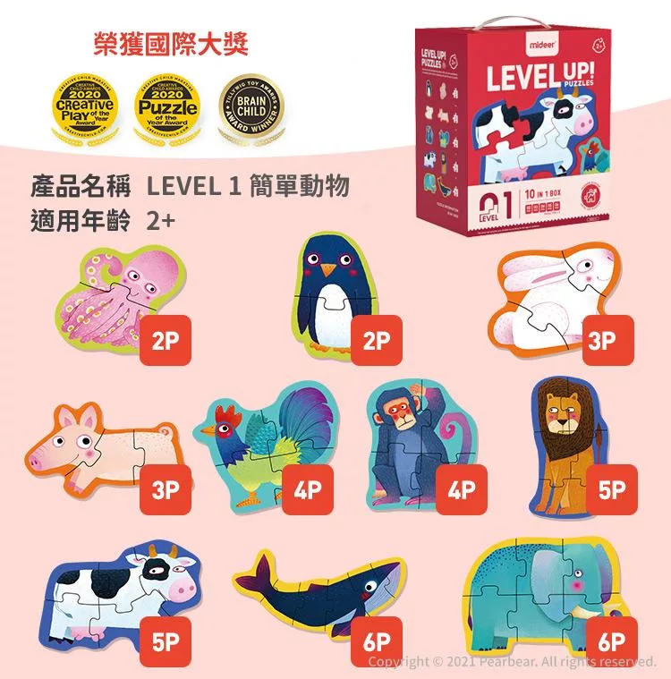 進階式拼圖-簡單動物(LEVEL1)。這是一系列由教育名師打造的進階式拼圖,一共有10款,每款的難度循序漸進,從簡單的3片到高難度得247片拼圖,依照孩子的年齡以及學習階段來選擇適合的拼圖。